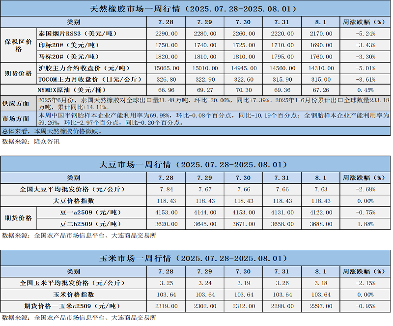 天然橡膠、大豆、玉米市場(chǎng)一周行情(2025.07.28-08.01)