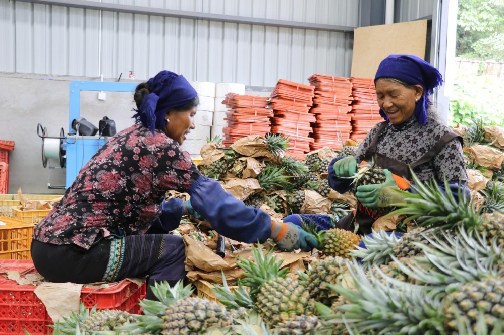 金鉆鳳梨進(jìn)入豐收期后,基地吸納不少務(wù)工人員,讓農(nóng)戶實(shí)現(xiàn)“家門口”就業(yè)?!拔覀兎謷S每天需要30名工人,在這里上班的村民,每人每天有100元左右收入?!崩钫终f。務(wù)工人員朱艷開心地表示:“以前想打工得去外地,現(xiàn)在在‘家門口’干分揀工作,既能照顧家里又能掙錢,太方便了!”
