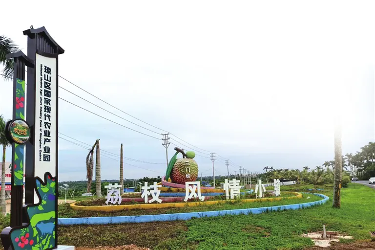 從??诔霭l(fā),沿223國道一路南行,在一片一眼望不到邊的荔枝園旁,一顆碩大的“荔枝”闖入眼簾,旁邊“荔枝風(fēng)情小鎮(zhèn)”幾個大字,讓人馬上意識到已抵達(dá)三門坡鎮(zhèn)。