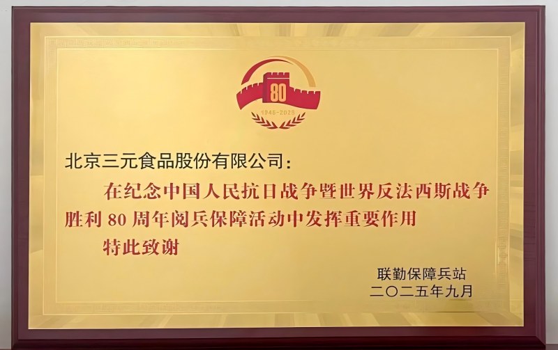 2025年9月3日,中國人民抗日戰(zhàn)爭暨世界反法西斯戰(zhàn)爭勝利80周年紀念活動隆重舉行。在這場國家盛事的背后,三元食品以高度的責任感和使命感,全力肩負起訓練基地乳制品及閱兵餐包酸奶的供應保障任務,以卓越的產品和可靠的服務,全面踐行著國有企業(yè)的責任與擔當。