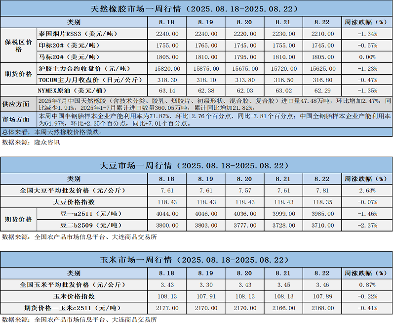 天然橡膠、大豆、玉米市場(chǎng)一周行情(2025.08.18-08.22)