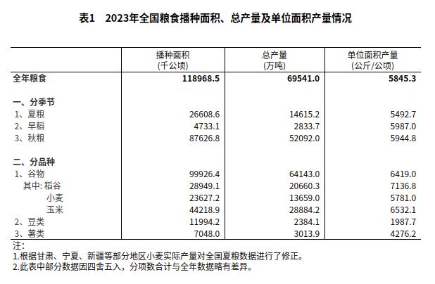 三、全國糧食總產(chǎn)量69541萬噸(13908億斤),比2022年增加888萬噸(178億斤),增長1.3%。其中谷物產(chǎn)量64143萬噸(12829億斤),比2022年增加819萬噸(164億斤),增長1.3%。