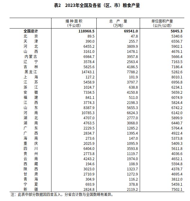 根據(jù)對全國31個?。▍^(qū)、市)的調(diào)查,2023年全國糧食播種面積、單位面積產(chǎn)量和總產(chǎn)量分別如下: