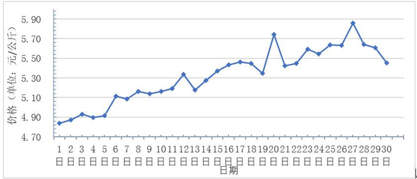 11月,全國(guó)重點(diǎn)監(jiān)測(cè)農(nóng)產(chǎn)品批發(fā)市場(chǎng)香蕉總交易量達(dá)9萬噸,同比上漲8.4%,環(huán)比下降2.2%;總交易價(jià)值 48607.5萬元,同比上漲35.1%,環(huán)比上漲14.1%。日平均價(jià)格最高為5.9元/千克,最低為4.8元/千克,全月平均價(jià)格為5.3元/千克,同比上漲12.8%,環(huán)比上漲6%(每日價(jià)格變化如圖)。